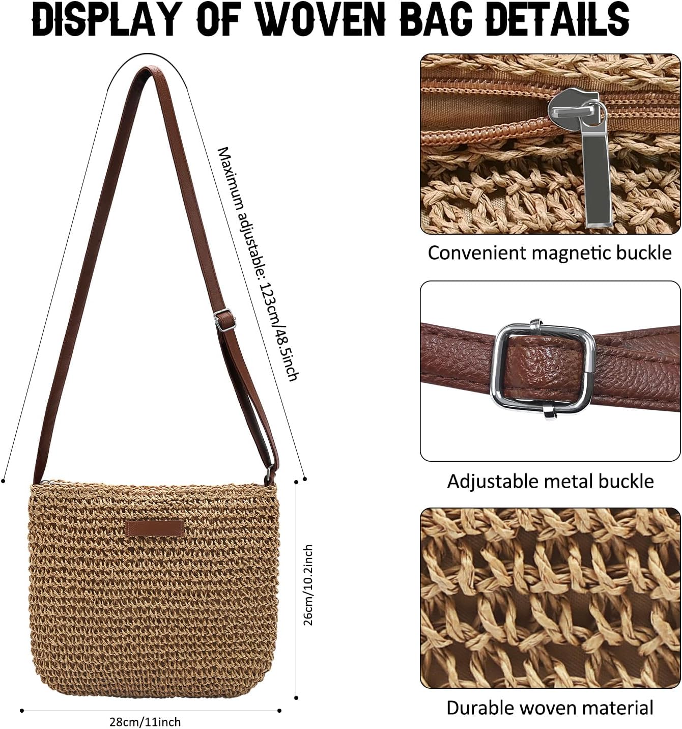 Straw crossbody baggage for ladies completely sized to accommodate necessities like cellphones, wallets, sun shades, cosmetics, folding umbrellas, and extra, with out being too cumbersome.