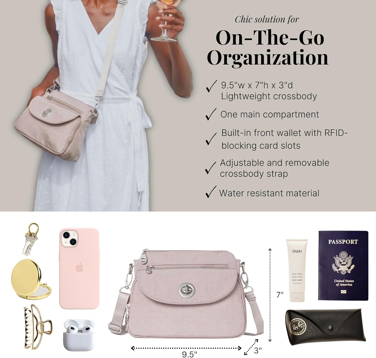 Baggallini Calais Crossbody Baggage for Girls 9.5″x7″ Journey Purse Purse w/RFID Entrance Pockets Light-weight Water-Resistant