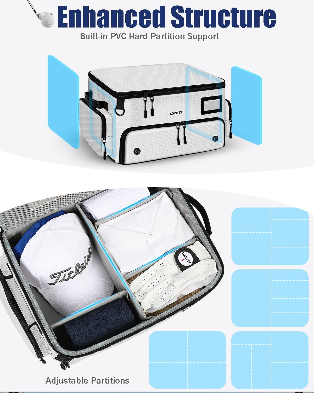 Unprecedented Storage House: LOINTET golf trunk organizer is specifically designed for all golf equipment. 4 layers of storage divided into 17 pockets. The underside layer is designed with 2 breathable shoe pockets. The center compartment has 5 adjustable partitions for golf shirts, hats, gloves, and many others. The dustproof compartment has 3 storage grids above and beneath for towels, scoreboards, and many others. The lid is designed with 5 partitioned storage pockets, which might retailer Balls, Tees, Gloves, Equipment