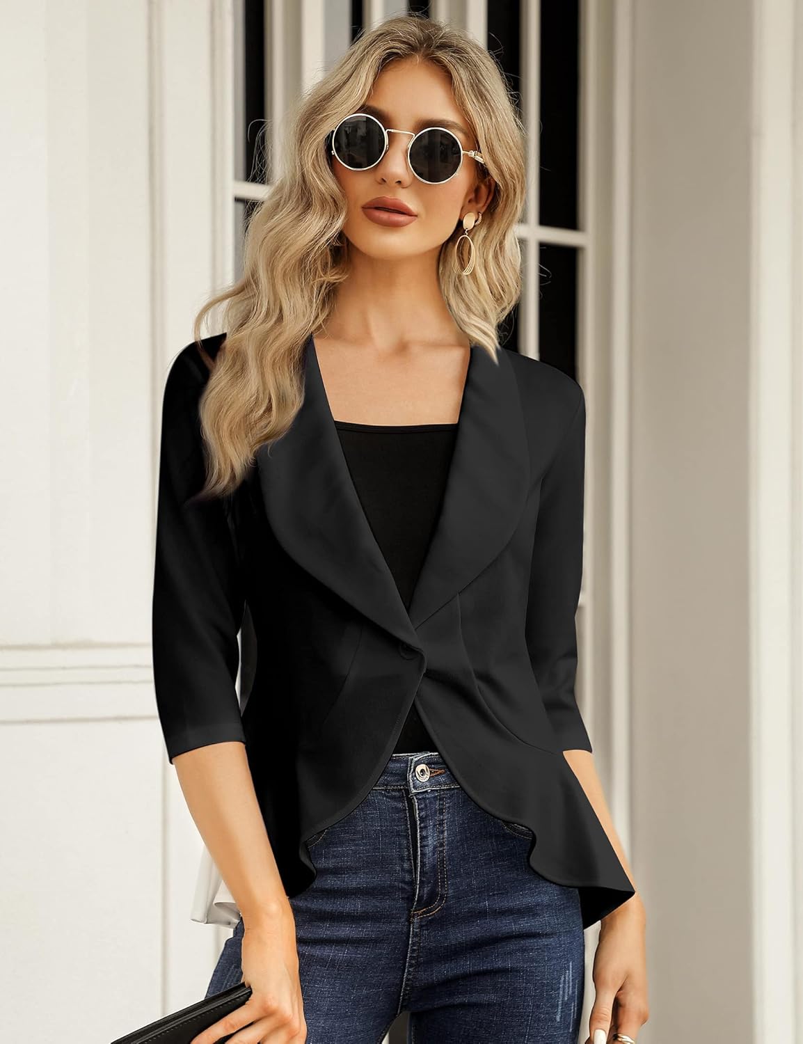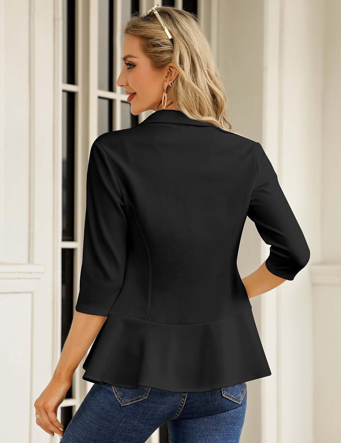 FEATURES: 3/4 sleeve workplace blazer jacket, primary scarf collar, black blazer for ladies, open entrance with a single entrance button, ruffle hem, slim match jacket swimsuit, stable coloration/floral print, no liner or shoulder pads.