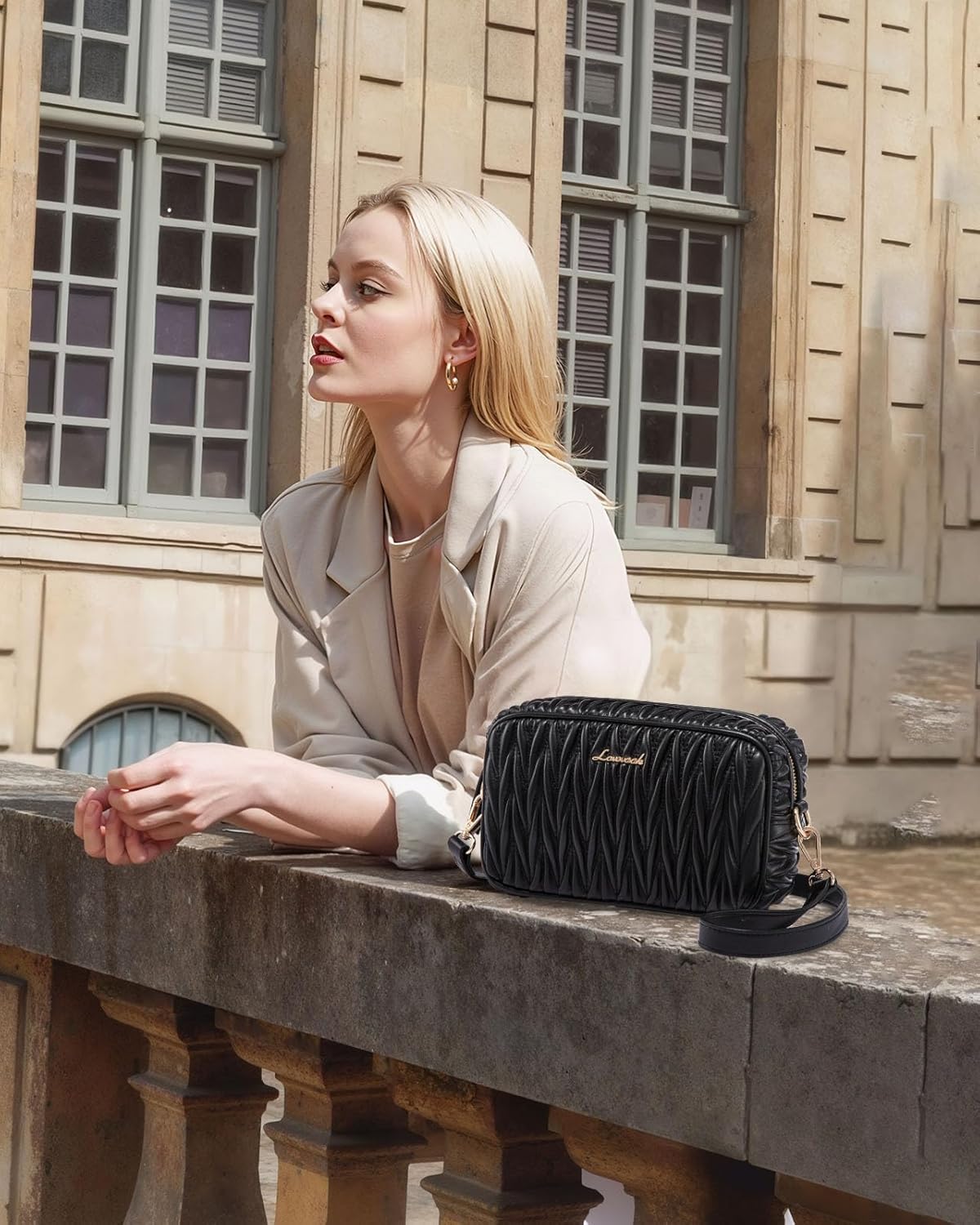 Super cute and stylish. I love the textured design. It adds style to any outfit. Its the perfect amount of space for your essentials like your phone, wallet, and lip gloss. The shoulder strap is adjustable for versatility. I have had many other bags from this brand an they never cease to amaze me. The color is exactly as advertised and the material is thick and high quality. Def worth the price.