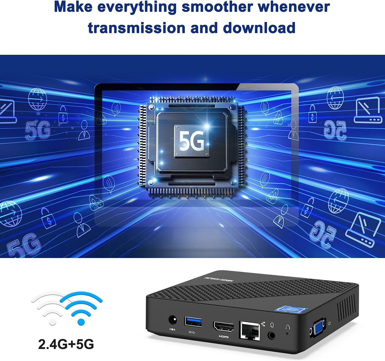 【Working Fear-free】N40 Mini PC Intel Celeron Processor N4020 Pre-installed, which is the upgraded model for N4000 , working frequency as much as 2.8 GHz. N40 PC pc helps 2.4G+ 5.8G twin Band Wi-Fi, BT4.2 and 1000Mbps LAN, working sooner brings you an excellent use expertise.