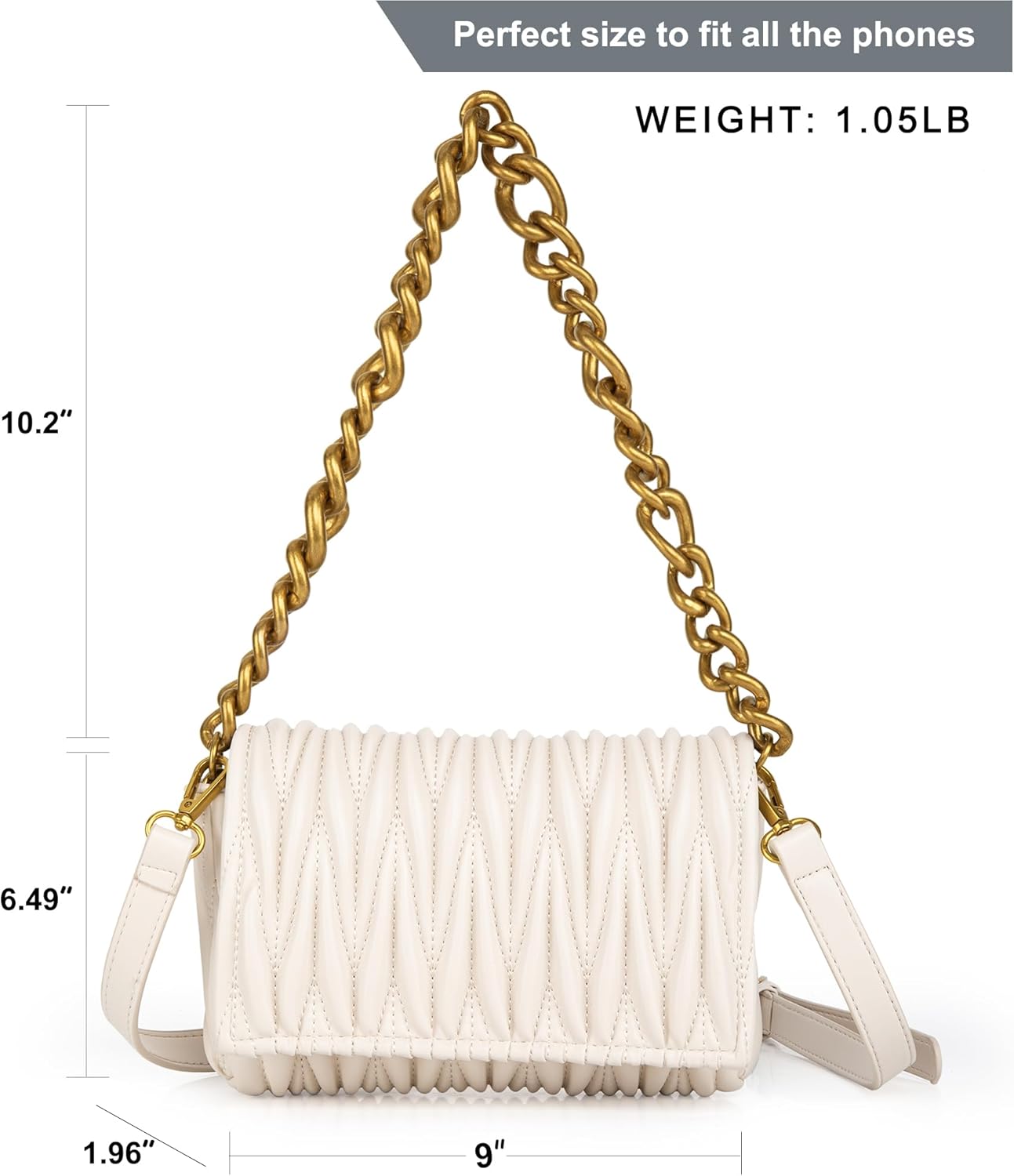 This cute bag is fabulous, it fit a large phone and all the essentials I need for an evening out. The chunky chain is very chic. It’s well made and you can’t beat the price. I highly recommend it.