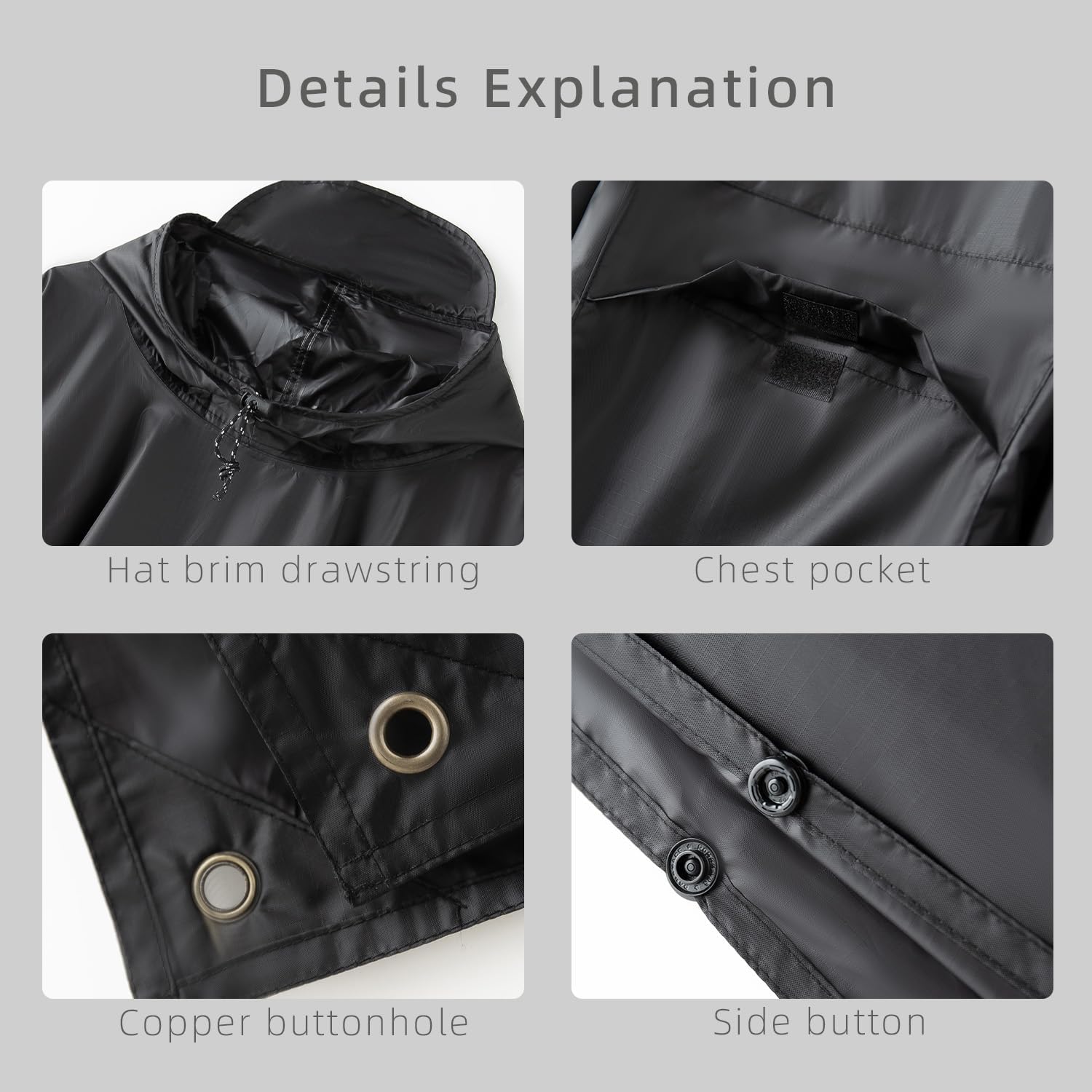 The raincoat is secured on the sides utilizing buttons to stop rain from coming into by means of these areas