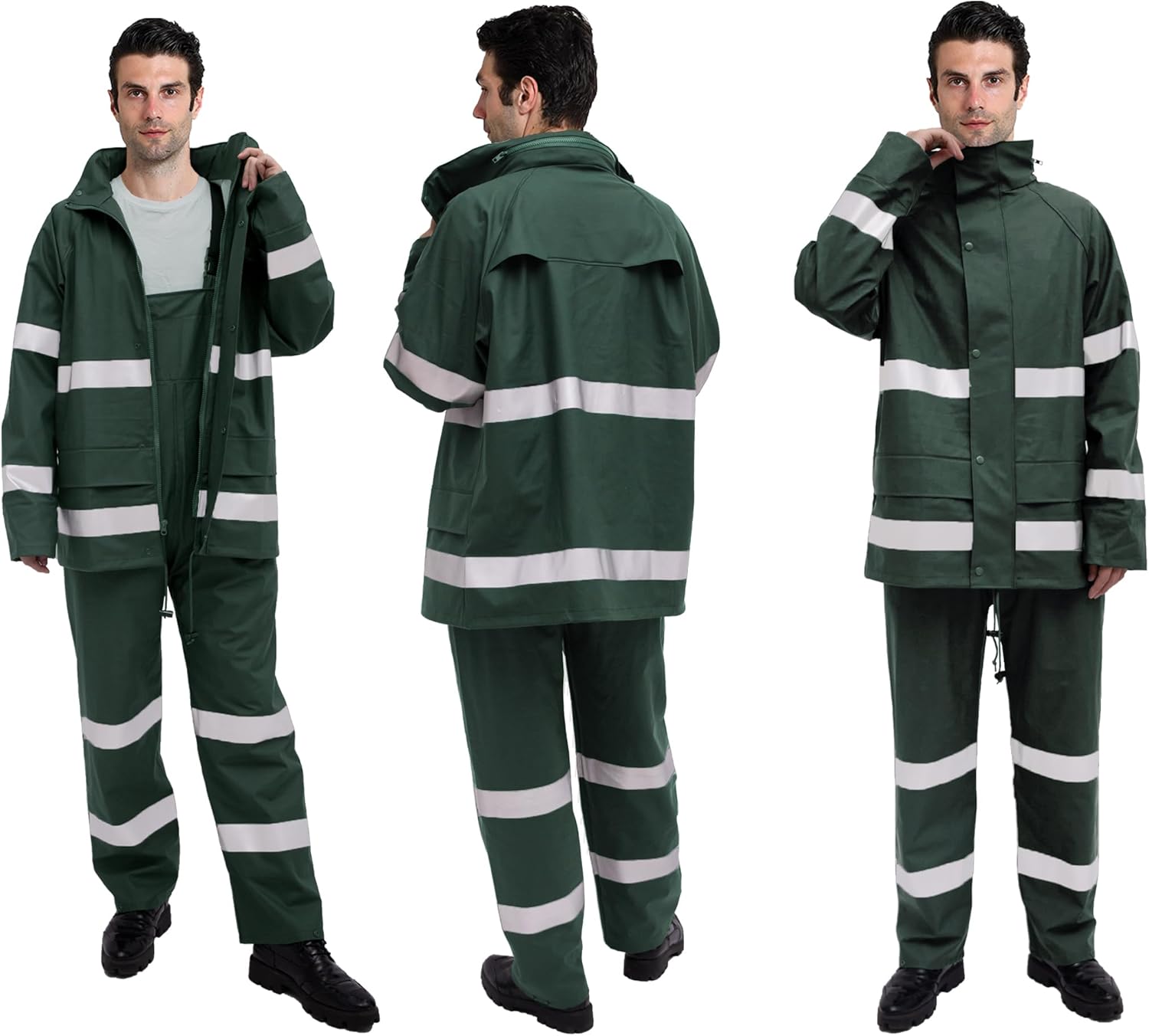 This rain suit is heavy, looks great, and is well-made. Stitches and seams reflect great workmanship. It looks like stuff worn by professionals such as firefighters or police officers. Its webpage defined it as a “rain jacket with pants set (that) provides complete coverage.” Well, not really. By the way it is designed, its users are well protected against the rain except their feet; therefore, it would be nice if a pair of rain boots were included.The jacket has two large pockets and a hood to keep our heads and hairs dry. Its hood is good but can be improved, such as adding a permanent visor to it to keep the raindrops from rolling down our faces. We can wear a regular cap and then put the hood over it, but it does not look as nice.I noticed that wearing this rain suit quickly increased my body temperature. It was quite warm, so I searched its webpage to find out if “breathability” was one of its attributes, but to no avail. Its webpage never describes it as breathable. Searching for the type of material this rain suit is made of was in vain. Its webpage vaguely describes the jacket and the pants to be made with “high quality materials” and “durable materials.” Normally, manufacturers or vendors would proudly define the “high-quality materials” their products are made of. Somehow, this manufacturer or vendor prefers not to do so. Curious, I examined the pants and jacket and found out that they are made of 80% PU, which is a type of plastic called polyurethane, and 20% polyester. Raincoats or rain suits made of PU are considered decent quality and durable. The issue is wearing them during cold days should be fine. Wearing them during warm days is quite uncomfortable for me. There are two openings in the back of the jacket to make it more “breathable,” but it does not help much. With only a swim trunk, I have been swimming in the frigid Pacific Ocean from the first day of January to the last day of December, twice a week for the last ten years before the pandemic. I thrive in cold weather but struggle in warm weather; therefore, the warmness of this rain suit bothers me but probably not other people, at least not as much; therefore, I will not consider its “warm” issue as a flaw.Overall, this is a good rain suit, and I recommend it. Please be careful about the size you order. I am a tad above 5 feet 11 inches, weighing 180 lbs., and the large size of this rain suit fits me well height-wise. Widthwise, it is very loose.