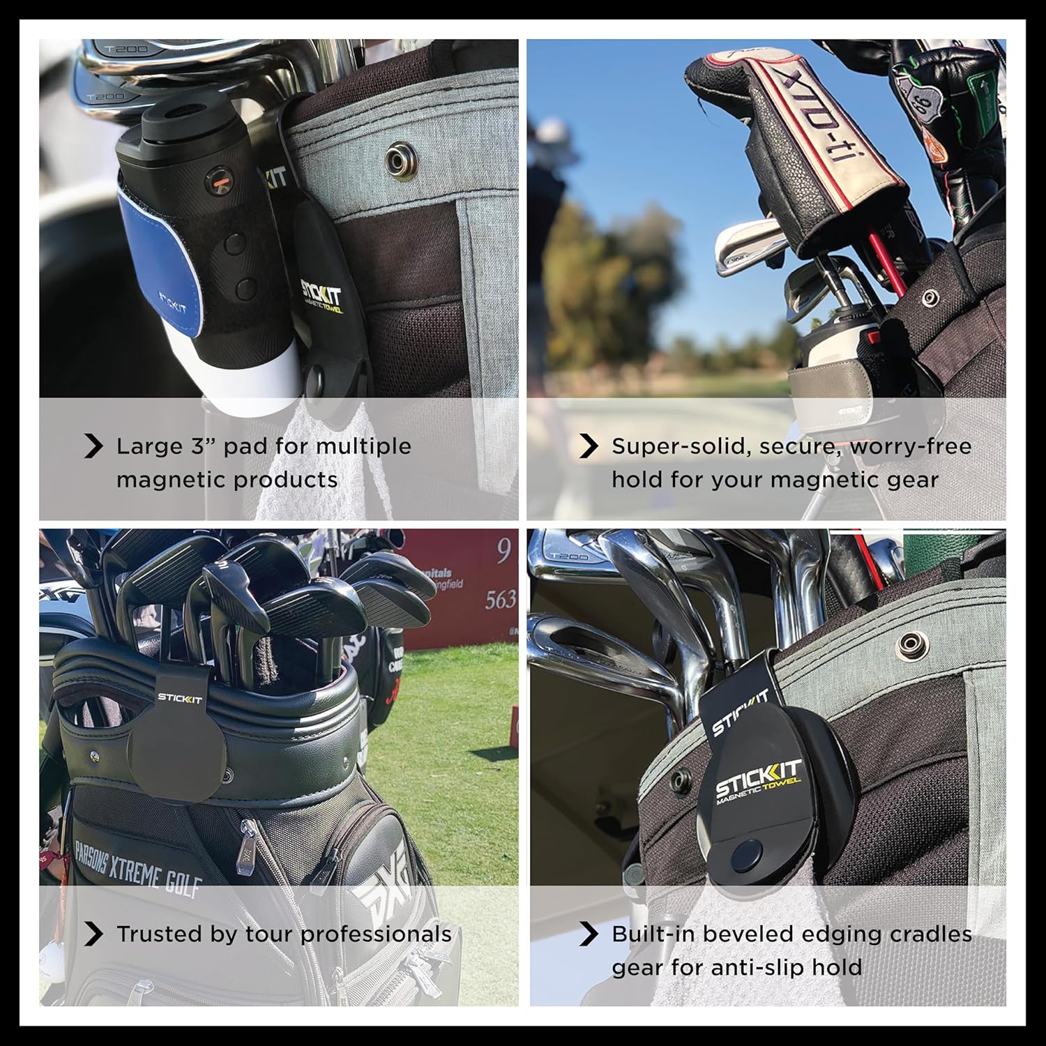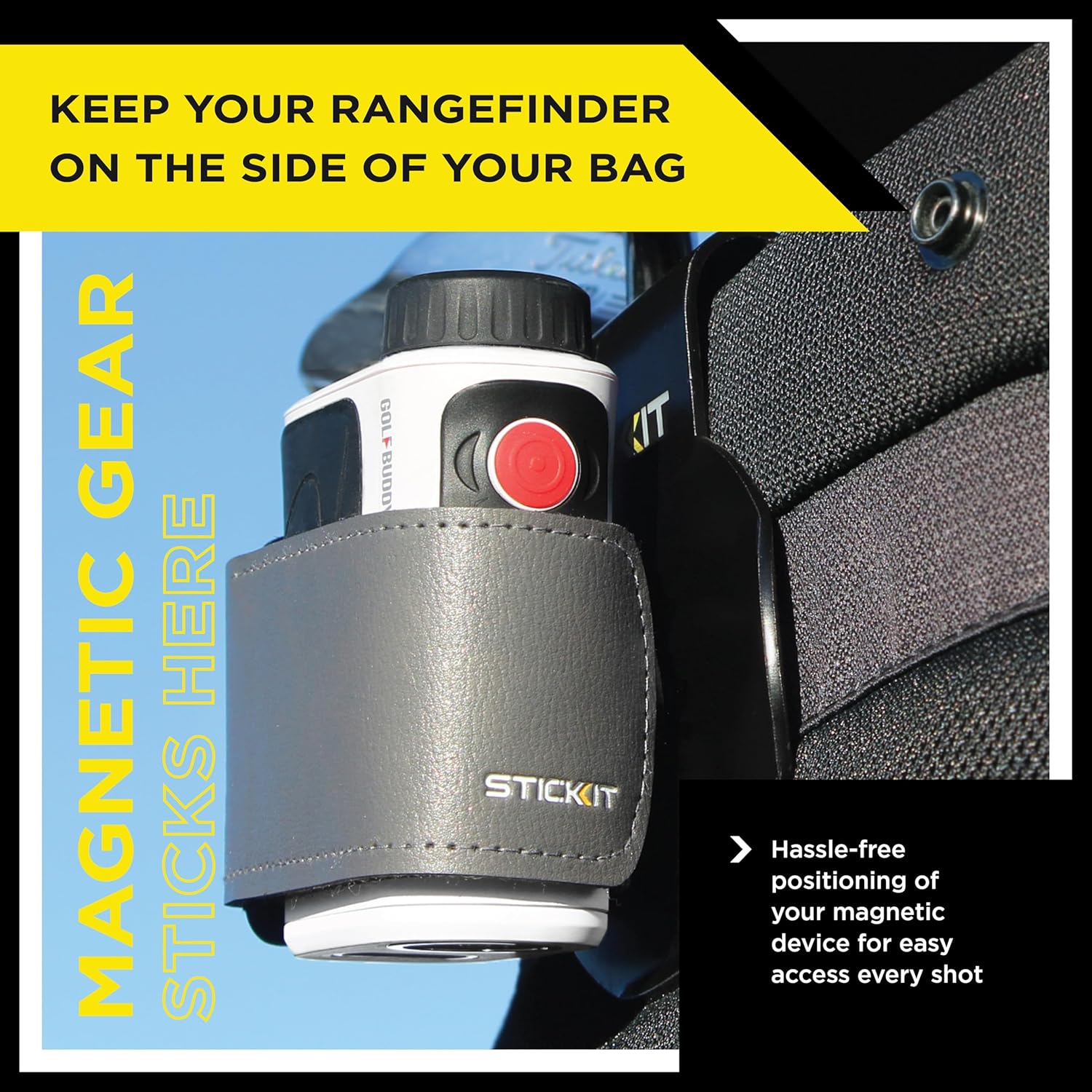MAGNETIC GOLF GEAR LANDING PAD FOR YOUR GOLF BAG Designed as a devoted STICKIT spot for handy positioning of all of your magnetic golf gear and equipment proper on the golf bag an ideal pairing for the STICKIT Magnetic Golf Towel and STICKIT Magnetic Rangefinder Strap