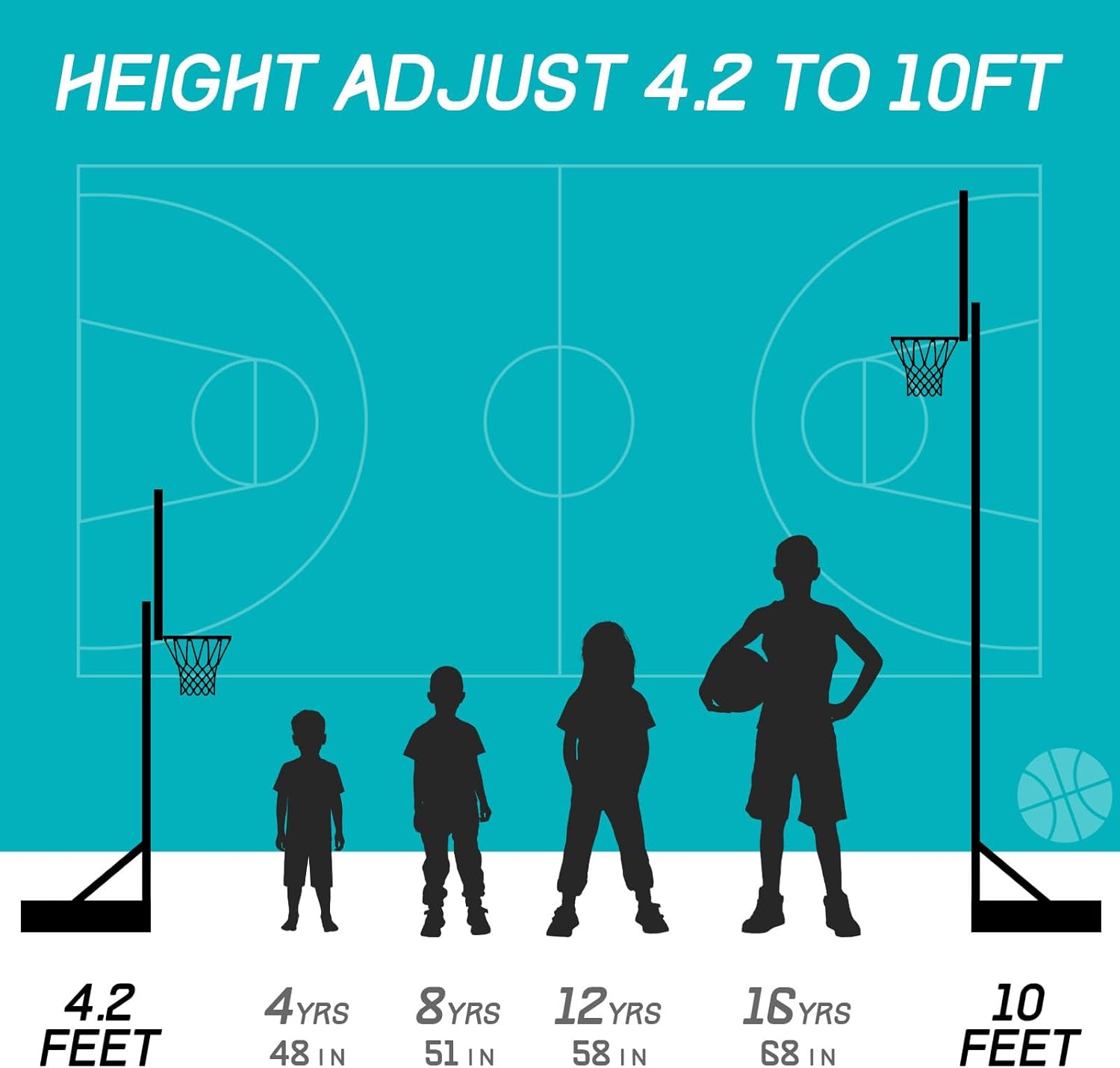 This is a great value, just plan on having a place to put the 3rd post if you want to use the lower heights. It’s adjusted by unbolting the backboard and reattaching it at a different point.For younger kids, get a size-4 basketball and it will be perfect.